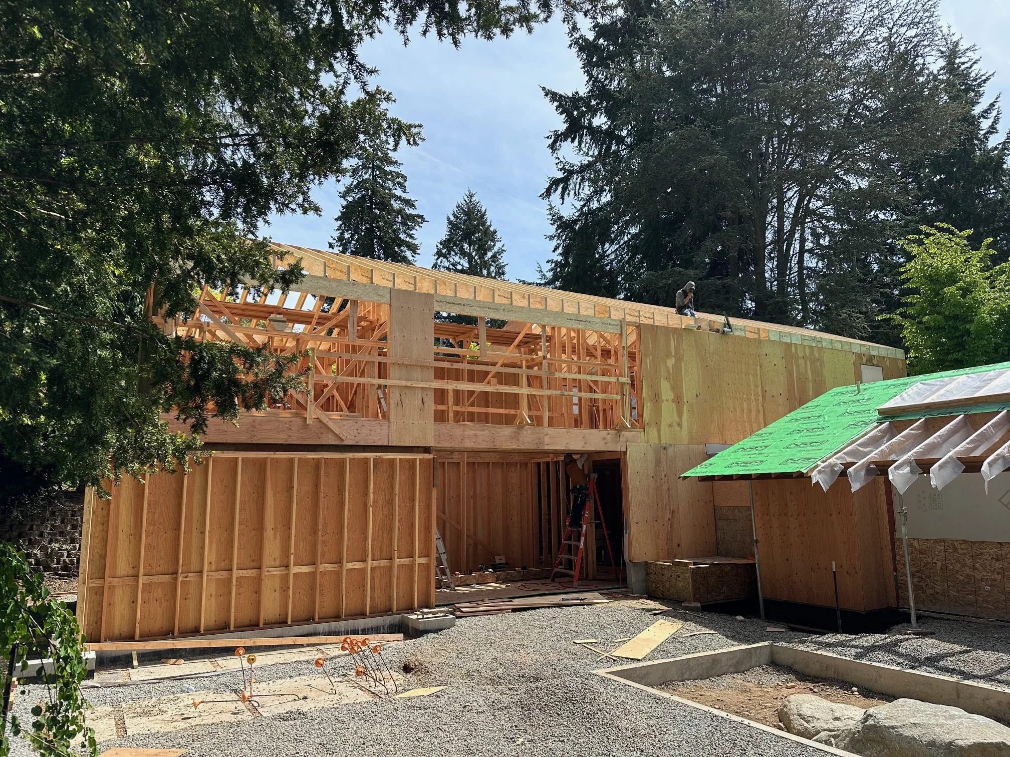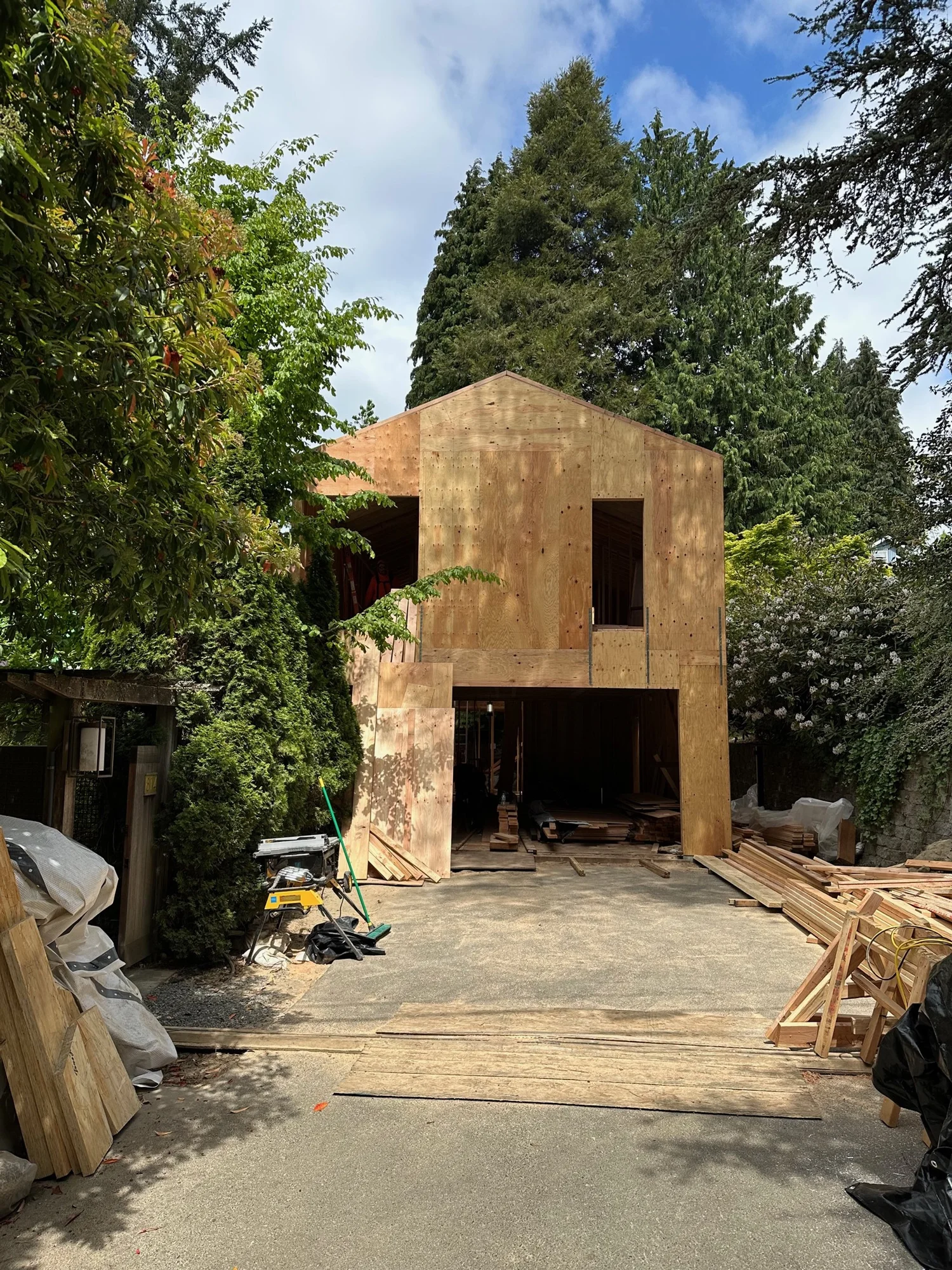 Addition and renovation to a 1940s home in the Broadview area of Seattle. The 2,700 sf addition completes an outdoor courtyard when added to the existing L shaped home. This courtyard provides new space for covered outdoor dining as well as focusing views into a re-worked garden on this heavily wooded double lot. A new woodshop tucks in at the rear of the addition behind a board formed concrete wall providing privacy and acoustic separation.