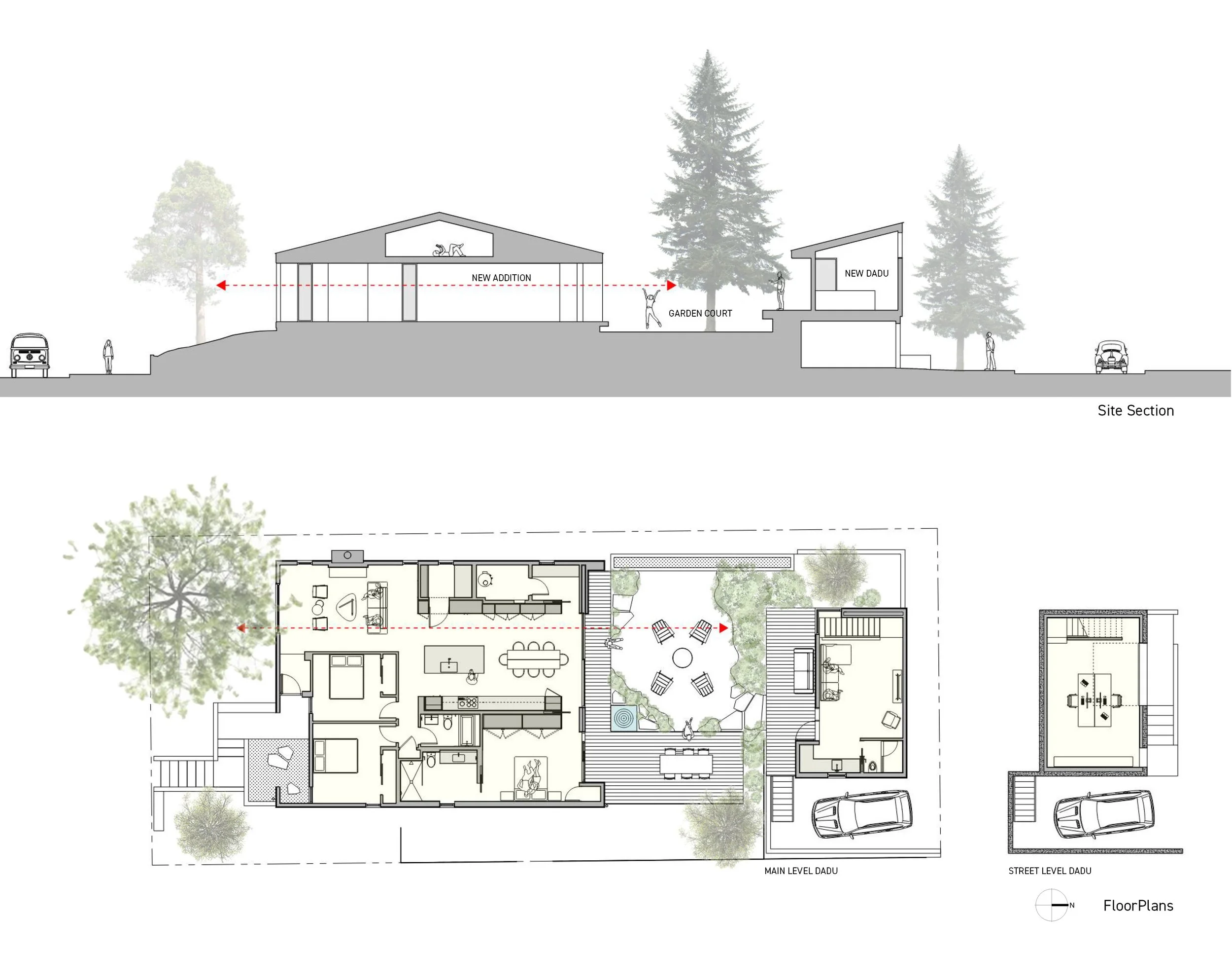 A new garage/dadu at the rear lot line is programmed with space for teenagers to hang out and space for adults to work from home.