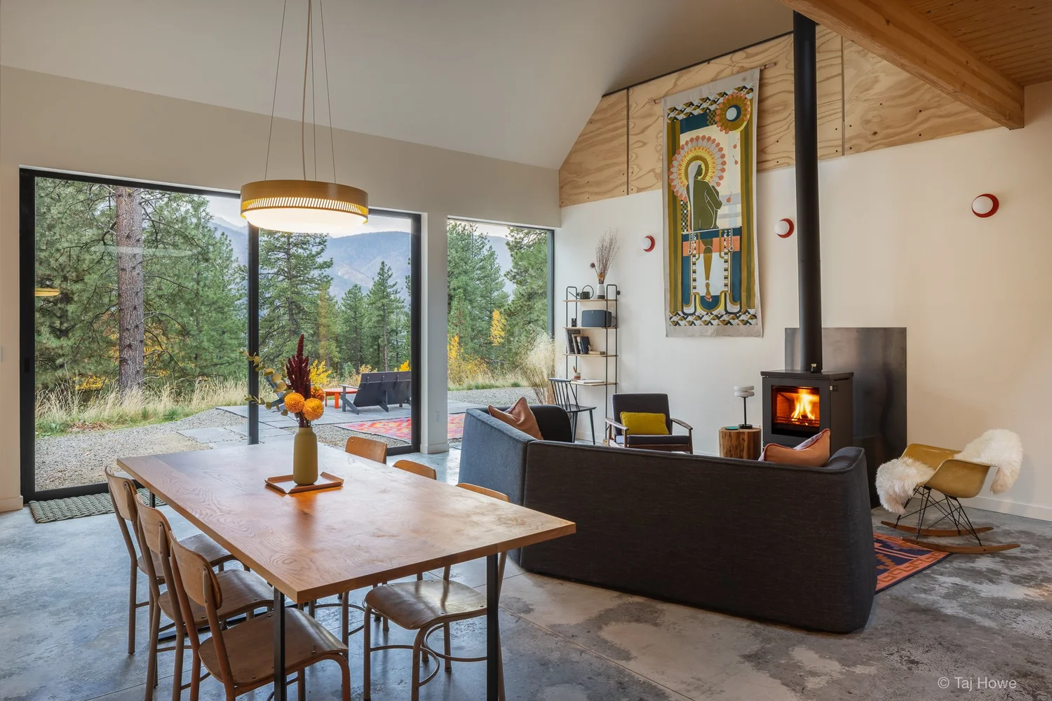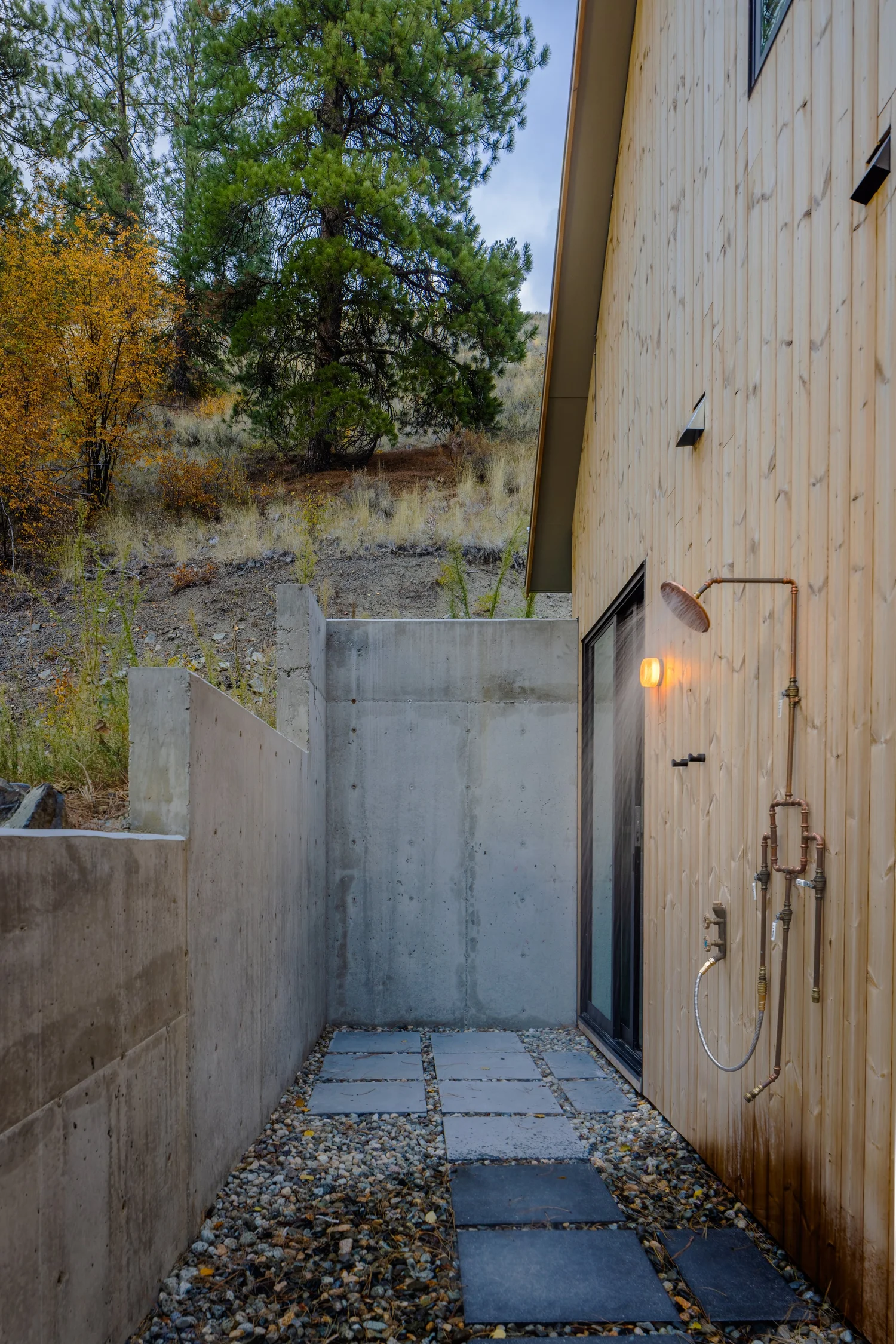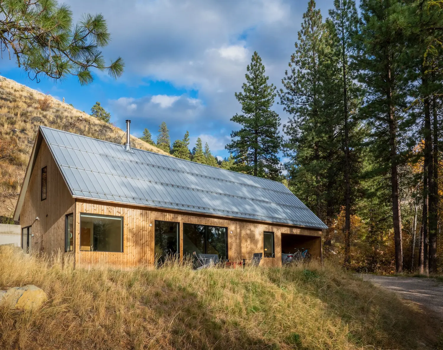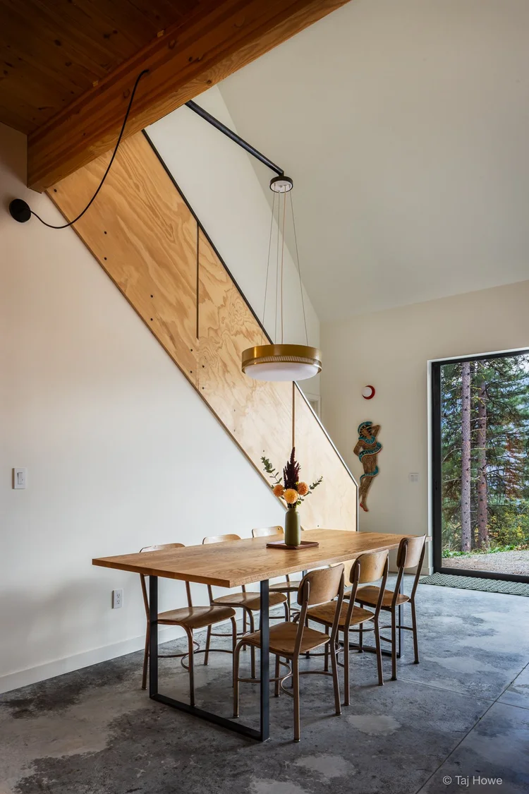 NewFitch Cabin is sited on a steep hillside in the Methow Valley, backing up to National Forest land. The project required a deep bench cut to create the build site and septic field, so to avoid the pitfalls of typical single family home placement (in the middle), the structure was designed as the retaining wall.