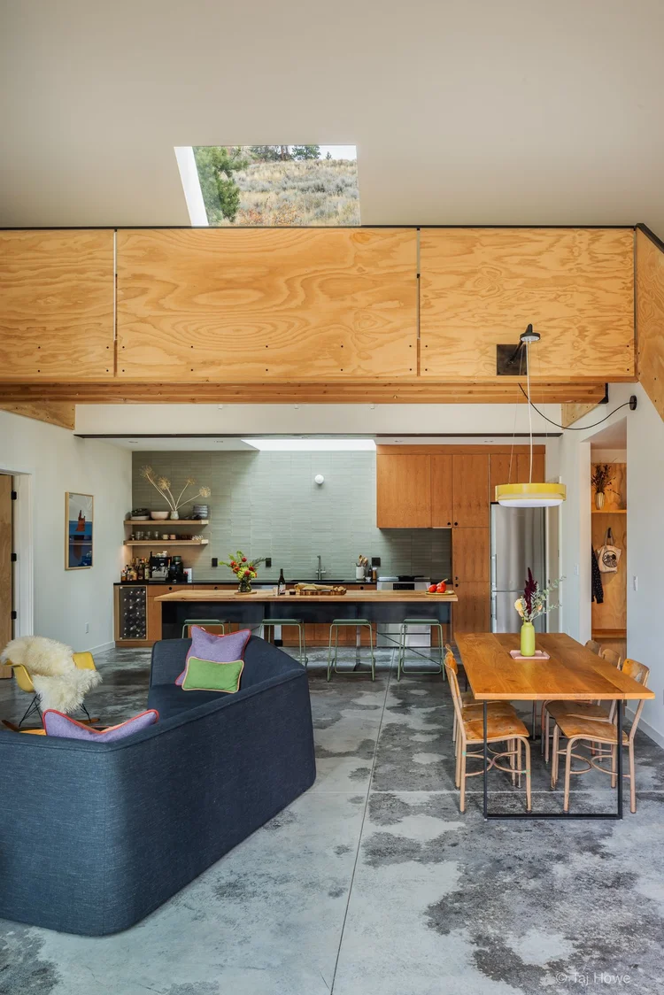 The material palette was conceived with economy in mind. The concrete slab is the finish floor and ACX plywood was used liberally for built-in furnishings and guardrails. As with all of our work, the focus was on letting natural light and the relationship to the outdoors do the heavy lifting.