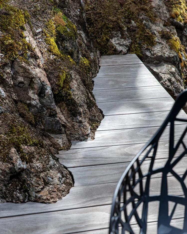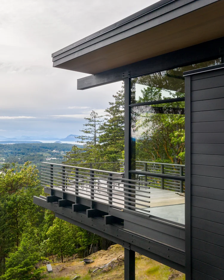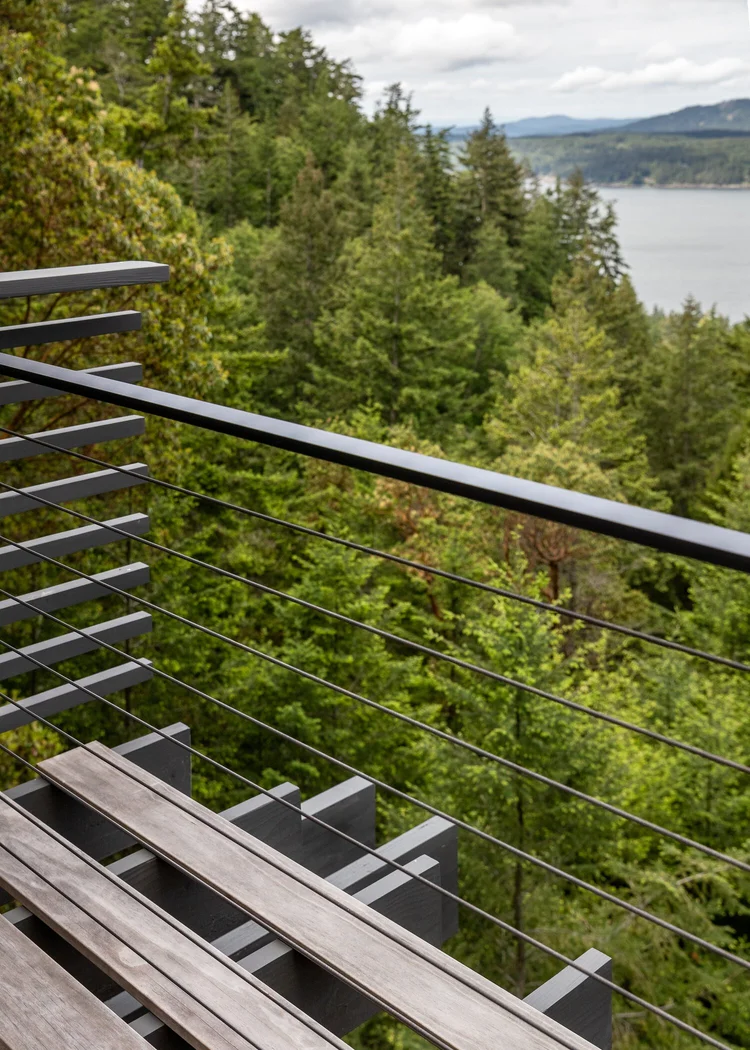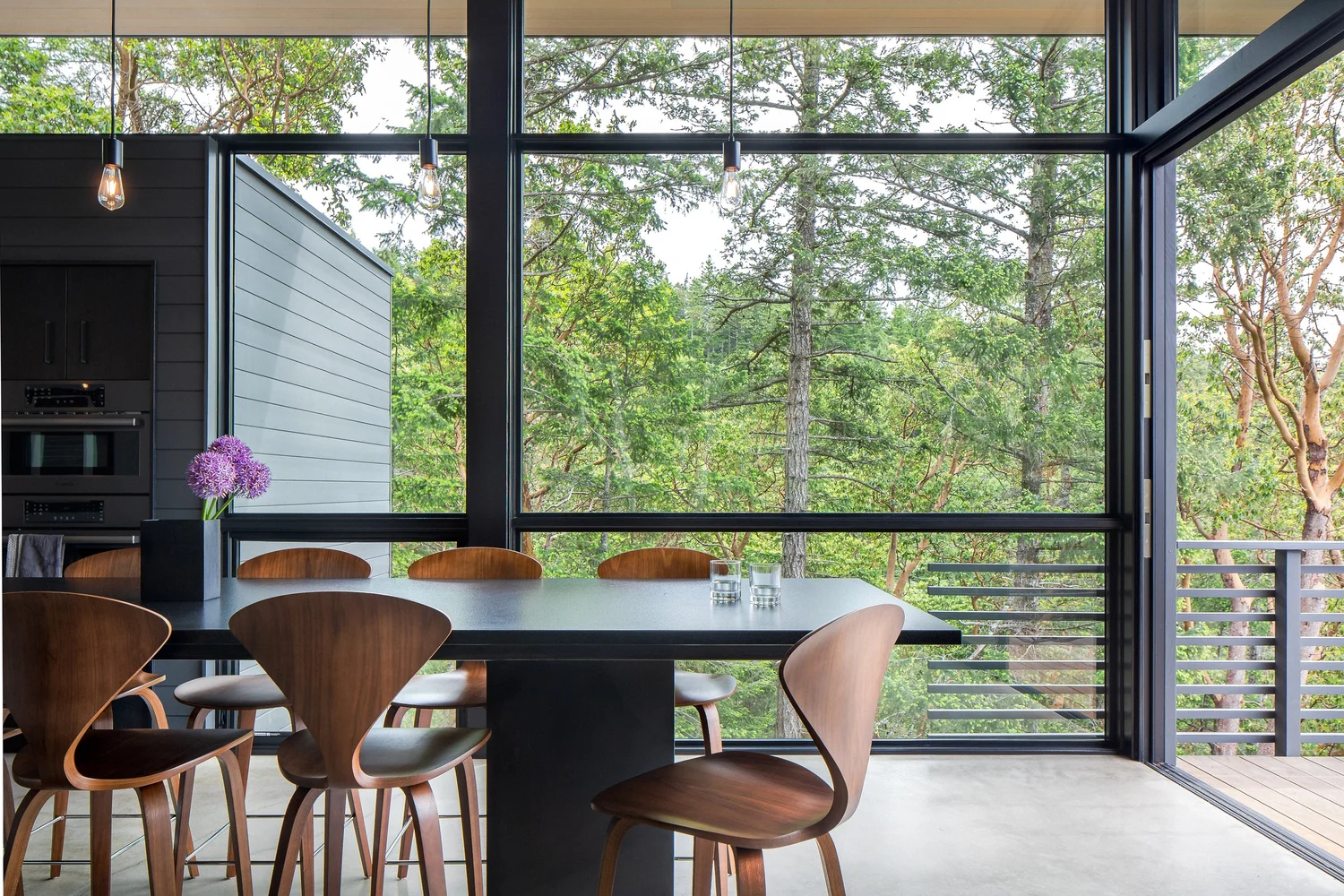 This Orcas Island project slips into an existing clearing found on site, stretching out from a natural rock outcropping to take in expansive forest and distant ocean views. The house touches the land as lightly as possible with minimal points of contact, delicately cantilevering over the landscape.