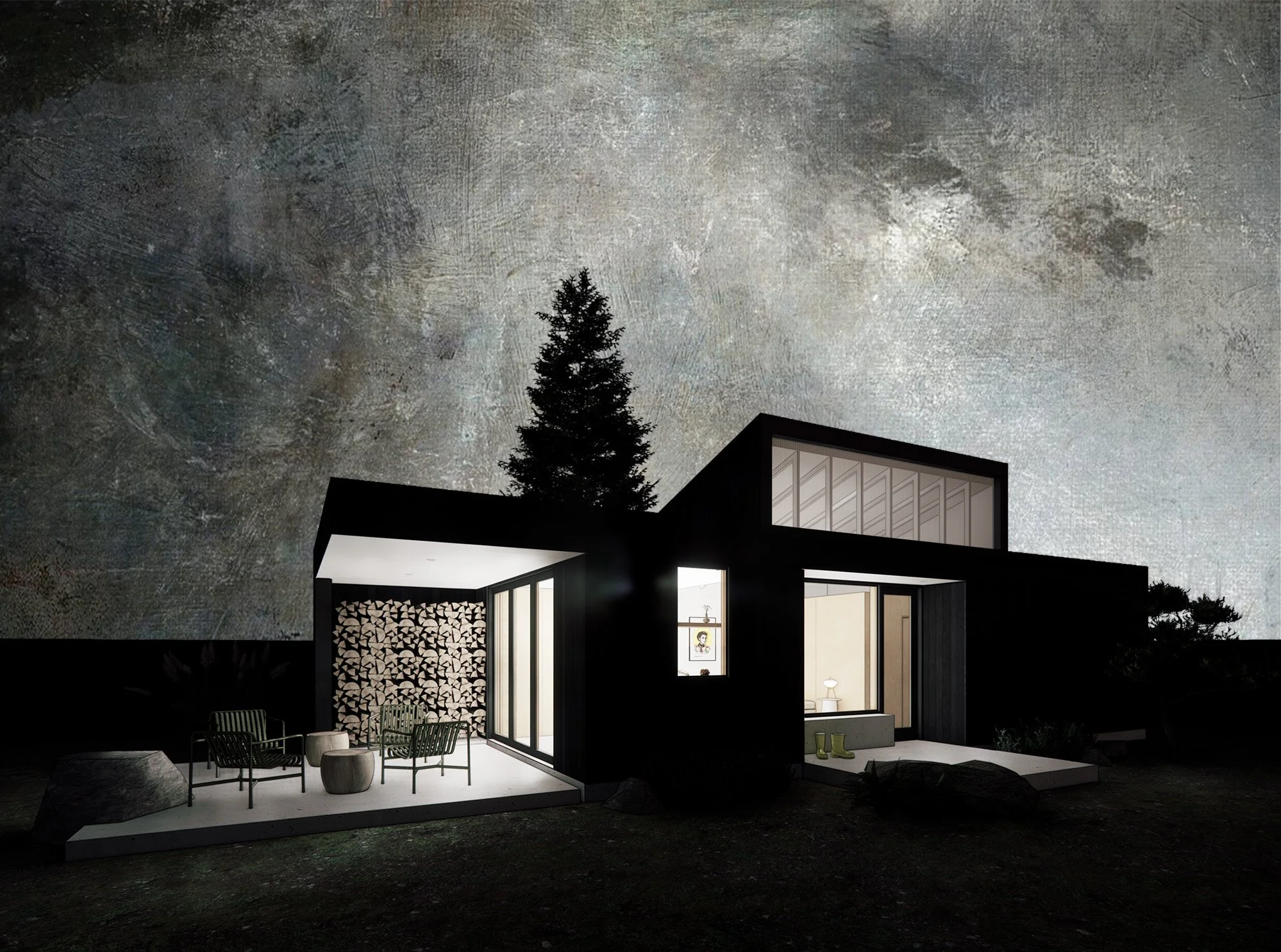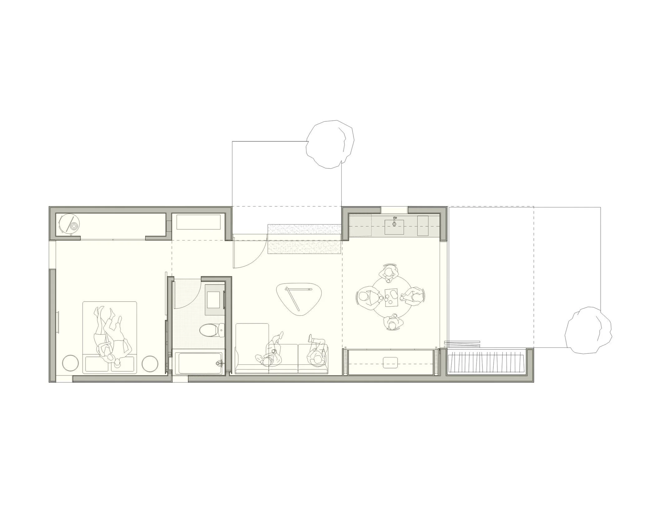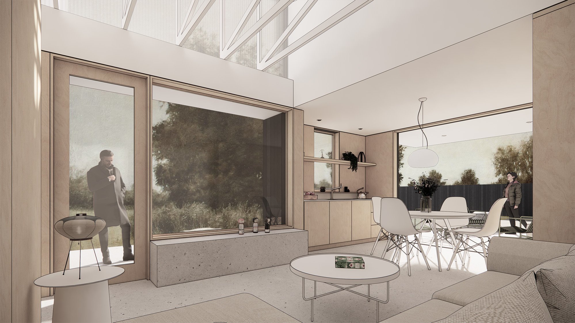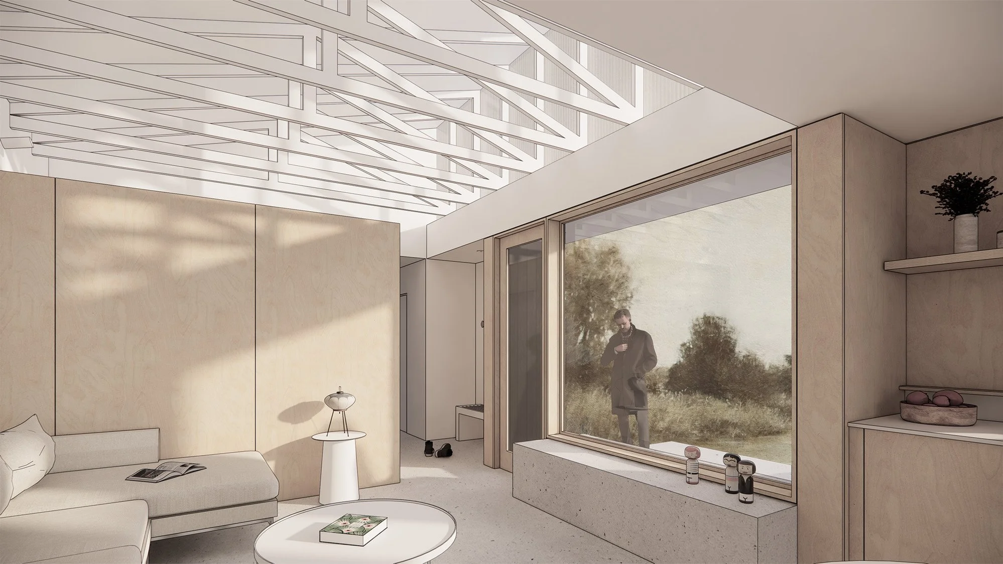 A new 575sf backyard DADU on Whidbey Island. This small project delivers a big impact with additional space for guests, a dedicated sewing area, ample outdoor space, views into the garden and a large clerestory window scooping up soft north light.